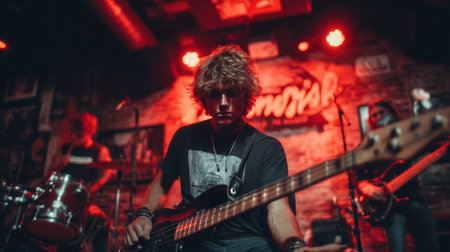 Passionate Performance Rock Band Electrifies the Stage with High-Energy Music and Red Lighting.
