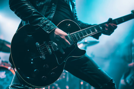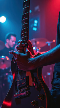 Musician on stage playing guitar in warm lighting, close up shot with blurred background