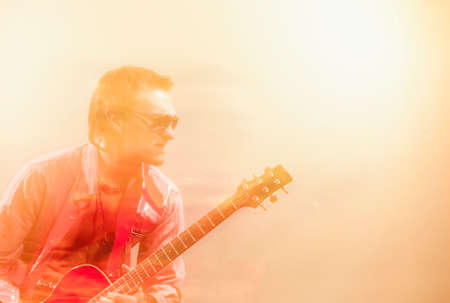 a man with a guitar emotions music game performance leather jacket sunglasses light background