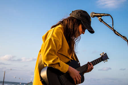 Tel Aviv, Israel - March 06, 2022 Young independent singer doing a music concert on the promenade facing the sea in Tel Aviv, artists are known in this way and sell their records at the same time