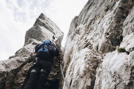Active lifestyle. Woman climb up on mountain. Rock climbing. Strong and fit athlete. Nature workout. Blue sky