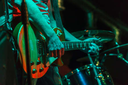 Close up of man playing on electric guitar during gig or at music studio. Musical instruments, passion and hobby concept.