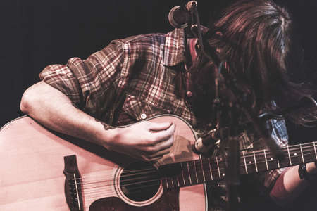Expressive Guitarist Player With Acoustic Guitar. Shot with Combination of Strobes and Halogen Light to Create Mood and Atmosphere. Mixture of Flash and Halogen Lights.Horizontal Image Composition