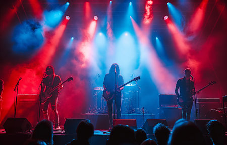 Rock band performing live on stage under dramatic lighting in a vibrant atmosphere