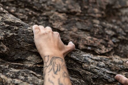 Free soloing rock climbing in nature, a technique where advanced climber scales crag without safety equipment, tattooed arm and hand grabs stone