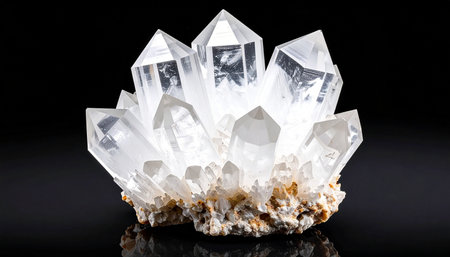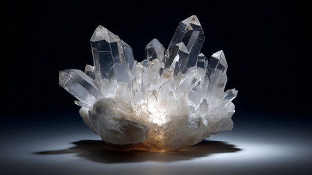 A stunning cluster of natural clear quartz crystals glows with inner light against a stark black background. Each point and facet captures the light, symbolizing purity, clarity, and concentrated energy. This raw mineral specimen evokes a sense of natural power and timeless beauty, perfect for themes of geology, spirituality, and healing.