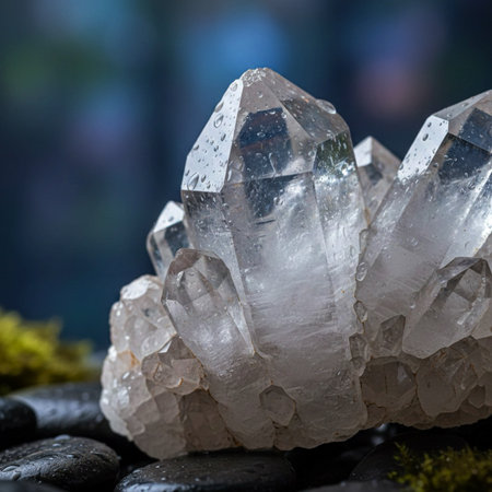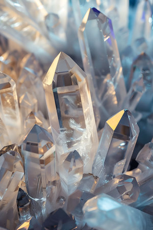 Clear quartz crystals with transparent surfaces showcasing multifaceted textures and clarity
