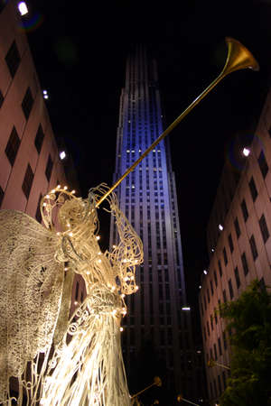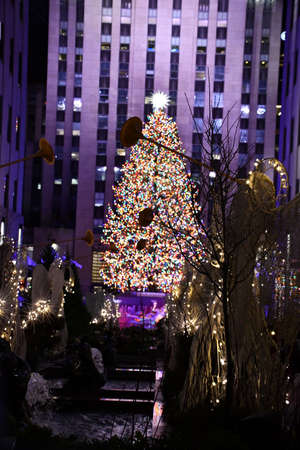 Vertical view of Rockefeller Center building and decorated Christmas Tree - New York City, USA