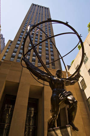 Statue of Ancient Greek Titan Atlas Holding up the Celestial Heavens on his Shoulders. Bronze Statue in Rockefeller Center. Manhattan, New York City, USA