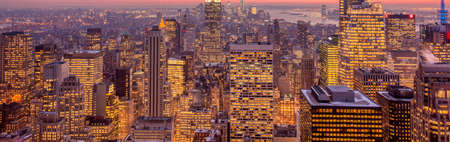 New York City Manhattan skyline panorama at sunset with skyscrapers.