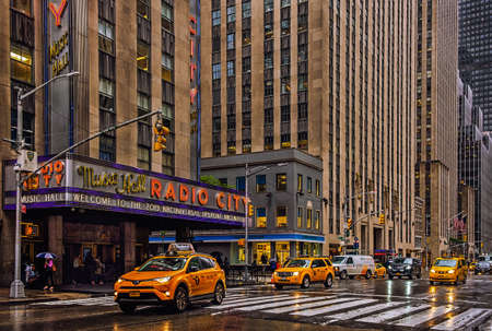 New York City, U.S.A, May 2019, facade of the Radio City Music Hall building on a rainy day
