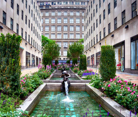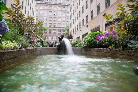 New York, USA – August 23, 2018: Rockefeller Plaza, Beautiful blooming flower, fountain and sculpture in the Channel Gardens at Rockefeller Center, New York.