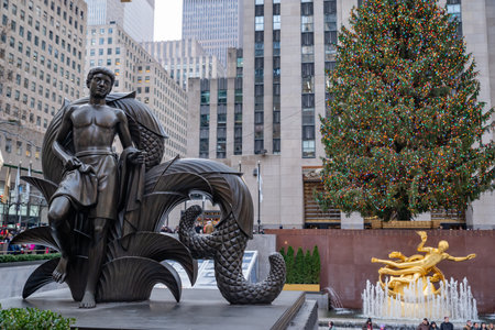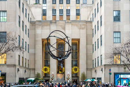 New York, NY – US – Dec 13, 2025 Rockefeller Center’s iconic 1937 Atlas statue depicts the Titan bearing the heavens, a 45-ft Art Deco landmark across from St. Patrick’s Cathedral.