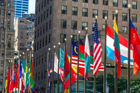 NEW YORK CITY, USA - MARCH 15, 2020: International flags at Rockefeller Center in Manhattan, New York City, USA