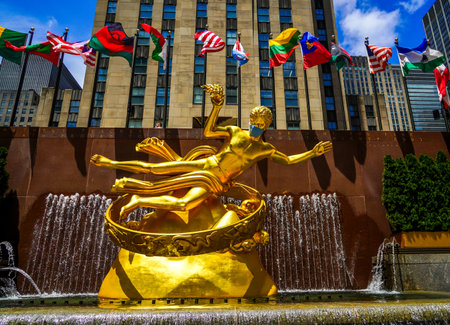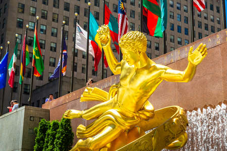 New York, USA – August 23, 2018: The golden Prometheus statue (ancient Greek god Prometheus) at Rockefeller Center with flags in Manhattan, New York, USA.