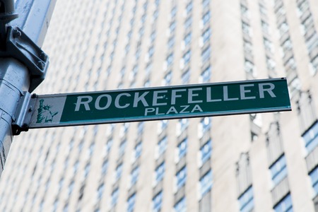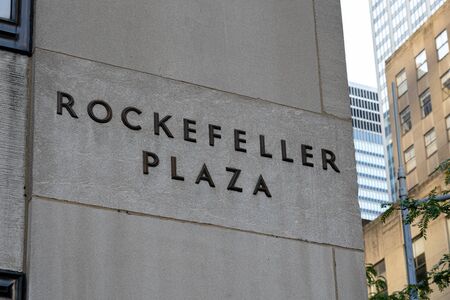 New York, United States - September 21, 2019: Rockefeller Plaza sign at the side of a Rockefeller building.
