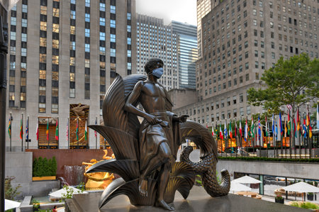 NEW YORK CITY - JULY 16, 2020: Atlas statue by Lee Lawrie with face mask in front of Rockefeller Center in midtown Manhattan during Coronavirus pandemic in New York