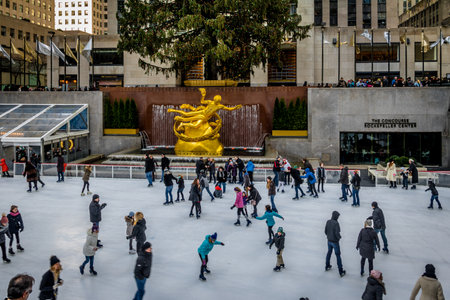 People ice skating in front of Rockefeller Center Christmas Tree - New York City, USA