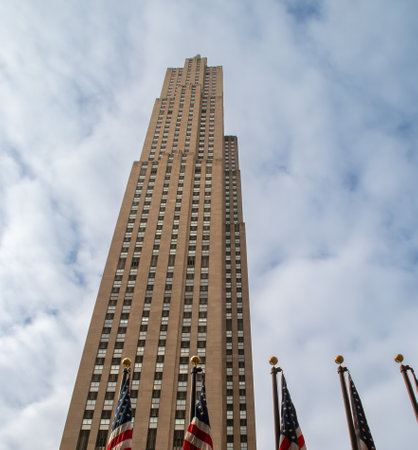 A view from below of the New York City skyline, USA, with a cloudy sky behind it. A view of the International Building (Rockefeller Center) with American flags at its base.