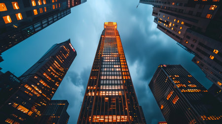 From a low angle perspective, a towering glass skyscraper pierces the overcast sky, its modern facade reflecting the cool tones of dusk.