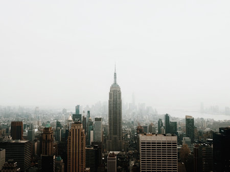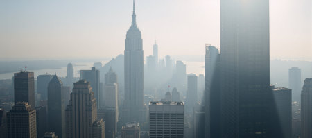 Urban landscape featuring iconic skyscrapers rising through a polluted haze symbolizing air quality issues
