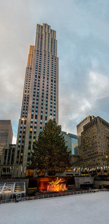 Vertical view of Rockefeller Center building and decorated Christmas Tree - New York City, USA