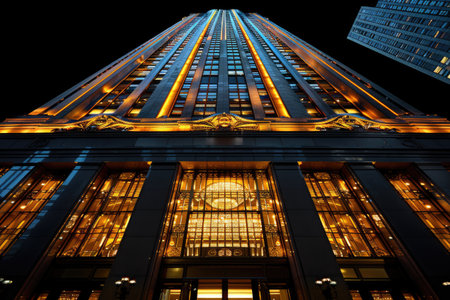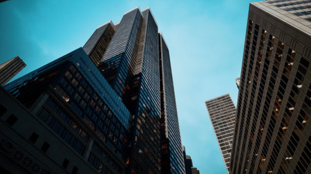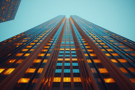 A tall building with glass windows and steel frames, captured from a low-angle perspective. The sky is a clear blue in the background, creating a sense of grandeur and scale. Use a wide-angle lens to capture the towering skyscrapers. --ar 3:2 --stylize 750 --v 6.1 Job ID: b3cad0e3-83f5-4cbe-b29f-de9973359827