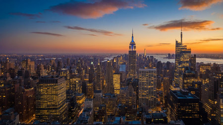 A stunning panoramic view of New York at sunset, showing its iconic skyline with a focus on the Empire State Building and vibrant cityscape bathed in golden light, capturing urban allure. AI generated image