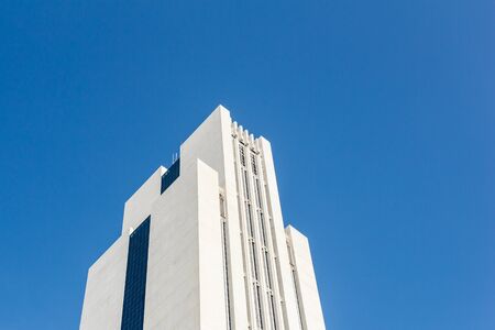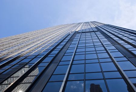 A high tower of a skyscraper reaching high into the sky. Symbol of progress and human power