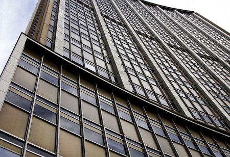 Low angled view of office building in financial district, Manhattan, New York, USA