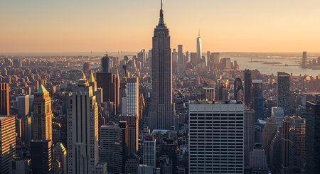 A stunning aerial view of the Empire State Building and the New York City skyline bathed in the warm glow of the setting sun.