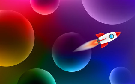 A small red and white rocket is taking off surrounded by colorful spheres on a playful surface.