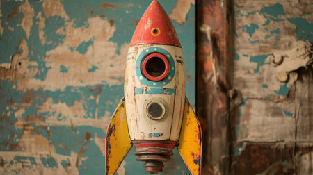 A vintage tin toy rocket ship with colorful details and worn edges, evoking a sense of adventure and nostalgia for past space exploration.