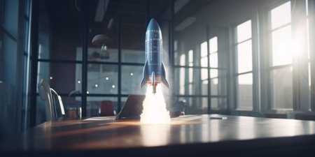 A rocket ship takes off from a desk in an office setting, representing the ambitious growth and success of a business or startup.