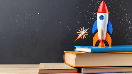 A vibrant toy rocket with a spaceship perched on a stack of books against a starry background, symbolizing the joy of learning and imagination in childhood.
