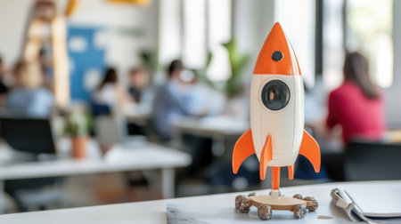 Toy rocket on desk in busy office environment