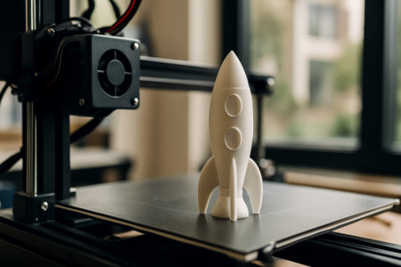 A white rocket model is displayed on a 3d printer bed in a modern workshop setting