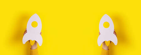 Yellow paper rocket, startup business concept