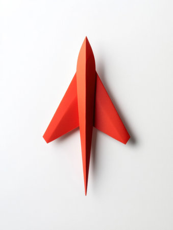 A red paper plane rests on a white surface, representing ambitions in business strategy, innovation, and solutions for success.