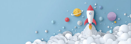 A paper rocket launches into a bright blue sky filled with fluffy clouds and vibrant planets, creating a playful and imaginative scene of exploration.
