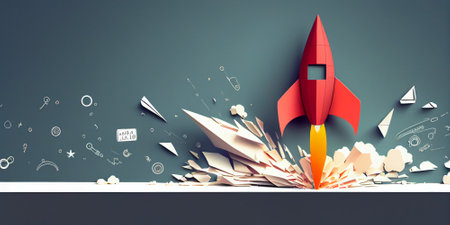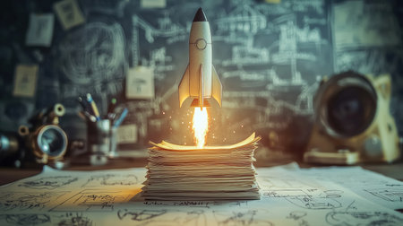 A conceptual image showing a rocket launching from a stack of papers, symbolizing ideas and creativity in a dynamic office setting.
