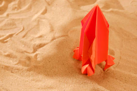 Paper red rocket on sand. Concept of new project start up idea