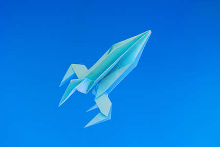 Paper origami rocket flies on a blue background. Space concept. International Day of Human Space Flight, Cosmonautics Day.