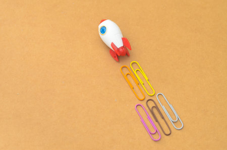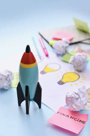 Composition with toy rocket and stationery on light blue background. Startup concept