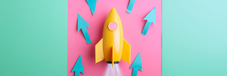 This image features a vibrant blue paper rocket atop a bright yellow background, embodying concepts of creativity, imagination, and playful innovation.