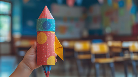 A child hand holding a colorful origami rocket against a blurred classroom background, symbolizing creativity and education. Candid and heartfelt