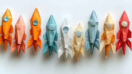 A fleet of tiny origami rockets in assorted colors, arranged in a playful formation against a stark white background, suggesting a paper space mission