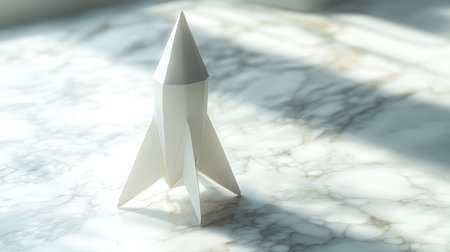 A minimalist white origami rocket on a white marble surface, its clean lines and subtle shadows evoking modern design. Serene and sophisticated.