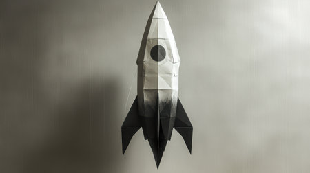 A single black-and-white geometric origami rocket, suspended mid-air with invisible string, casting a sharp shadow on a neutral gray backdrop. Modern and abstract.