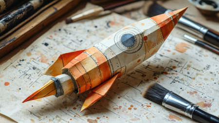 An origami rocket with watercolor-painted details, as if sketched by an artist, placed beside ink brushes on textured paper. Handmade artistry.